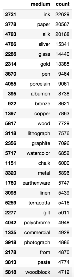 Using natural language processing, the "Mediums" text paragraph field was parsed for the most frequently used words in the MET's database of over 400k objects, resulting in a dataset of ~190k items in the top 9 materials.